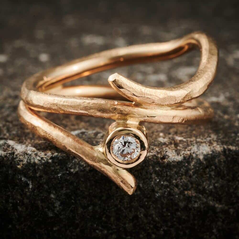 Lavet af 2 mm tråd. Max brede 13 mm. – guld 14 kt – med diamant 0,10 ct w/si